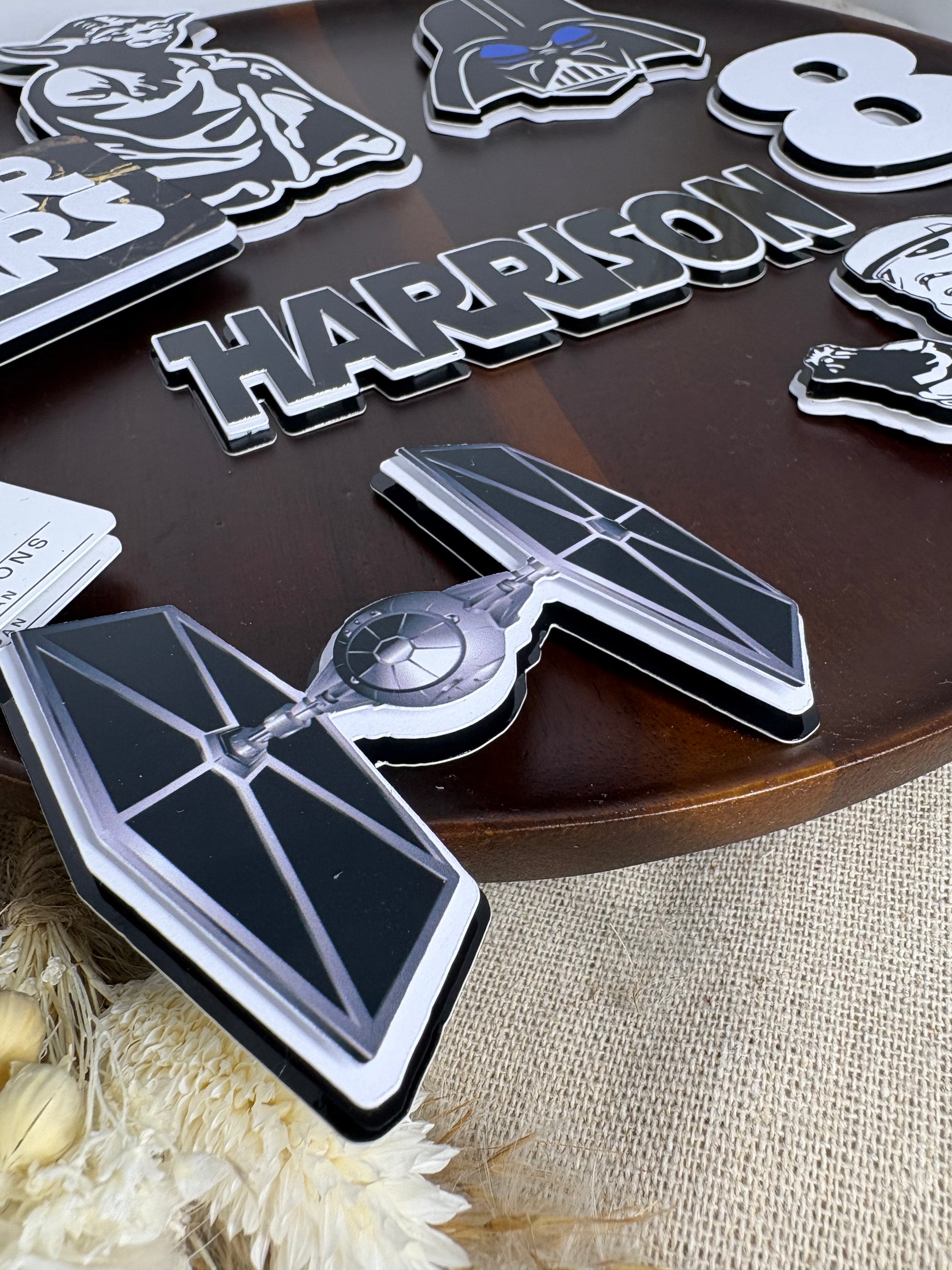 This listing is for a Star Wars personalised cake topper set, designed in a sleek black and white style and featuring iconic characters including Darth Vader, Darth Sidious, and a Stormtrooper. A bold and striking addition to any Star Wars–themed celebration.